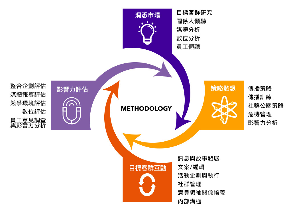 盛思透過四個「I」的方法洞悉市場 ( Insight )、策略發想 ( Idea )、目標客群互動( Interaction ) 與影響力評估 ( Influence ) 等步驟來訂定具創意和影響力的品牌與傳播策略。我們透過顧問諮詢來了解客戶的需求,藉由市場調查和策略分析來幫助客戶獲得市場洞見、找到定位,並結合對市場的了解訂定在地化策略幫助客戶傳遞訊息。最後,運用各種量化及質化的指標評估傳播方案的成效,持續為最佳的方案效果進行調整。